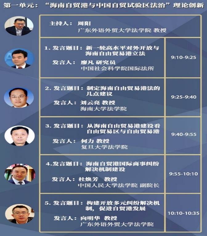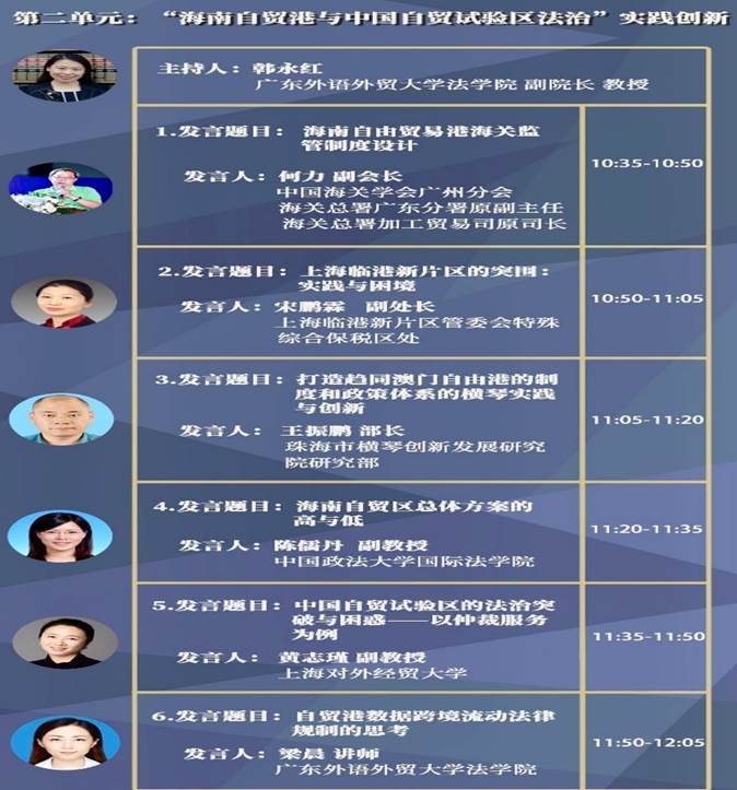 研讨会分两个单元进行。第一单元主题是“海南自贸港与中国自贸试验区法治”理论创新,由广东外语外贸大学法学院周阳教授主持。中国社科院国际法所廖凡研究员、海南大学法学院刘云亮教授、复旦大学法学院何力教授、中国人民大学法学院副院长杜焕芳教授、广东外语外贸大学法学院向明华教授先后围绕“海南自贸港立法、如何看待自由贸易区与自由贸易港的关系、海南自贸港国际商事纠纷解决机制建设”等主题展开深入研讨。第二单元主题是“海南自贸港与中国自贸试验区法治”实践创新,由广东外语外贸大学法学院副院长韩永红教授主持。中国海关学会广州分会何力副会长、上海临港新片区管委会特殊综合保税区处宋鹏霖副处长、珠海市横琴创新发展研究院研究部王振鹏部长、中国政法大学国际法学院陈儒丹副教授、上海对外经贸大学黄志瑾副教授、广东外语外贸大学法学院梁晨博士纷纷就“海南自贸港海关监管制度设计、上海临港新片区制度创新、打造趋同澳门自由港的制度和政策体系的横琴实践与创新、仲裁服务的制度创新、数据跨境流动法律规制”等议题进行探讨。