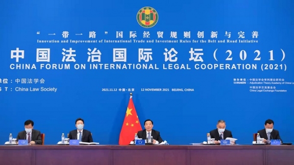 本届论坛由中国法学会主办,以“‘一带一路’国际经贸规则创新与完善”为主题,来自中国、俄罗斯、巴西、巴基斯坦、哈萨克斯坦、柬埔寨、古巴等20个国家和地区以及国际组织的代表以线上线下相结合方式出席。论坛发布了《中国法治国际论坛(2021)北京宣言》。