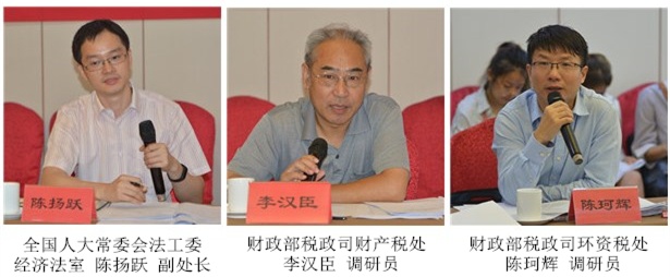 本次立法专家咨询会受到了中央有关部门的高度重视和大力支持。全国人大常委会法工委经济法室陈扬跃副处长,财政部税政司财产税处李汉臣调研员和环资税处陈珂辉调研员参加了研讨会。会议开始后,李汉臣调研员和陈珂辉调研员先后介绍了《耕地占用税法(草案)》和《车辆购置税法(草案)》的立法背景和主要考虑。