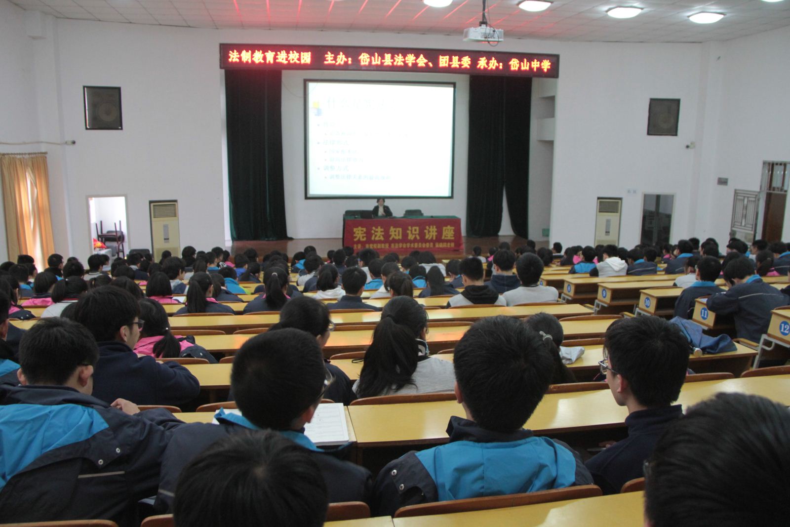 为迎接国家宪法日暨全国法制宣传日,进一步普及宪法知识,弘扬宪法精神,11月22日,舟山市岱山县法学会与团县委联合开展“法制教育进校园”活动,邀请舟山市委党校张晓鸥副教授为岱山中学400名师生作了“树立宪法权威 增强法治意识”的专题报告。