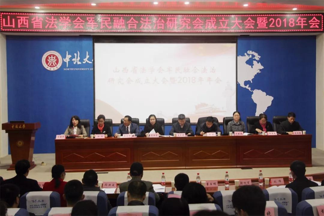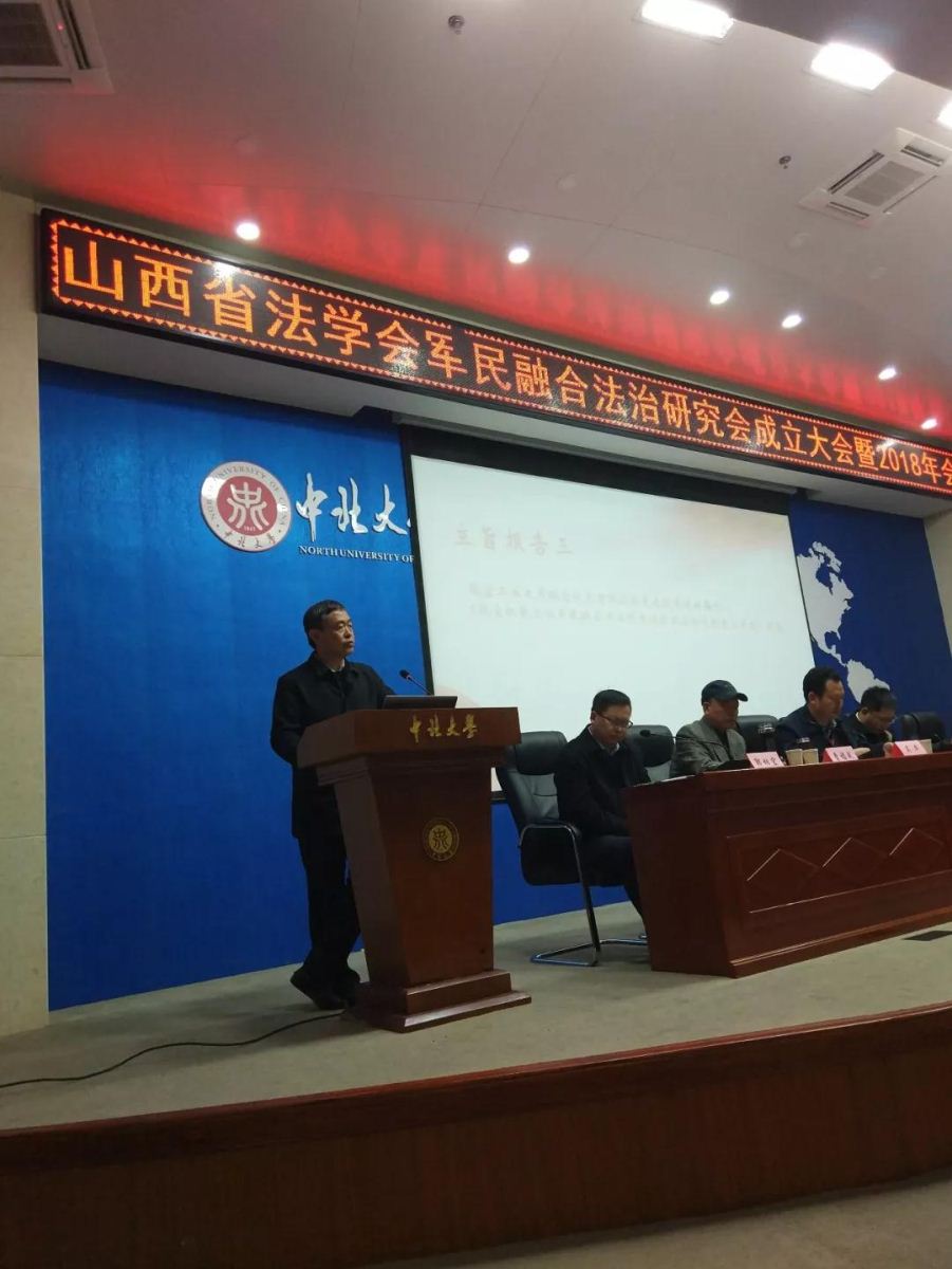 2018年11月24日,山西省法学会军民融合法治研究会成立大会暨2018年年会在中北大学瑾瑜国际会议中心召开。山西省法学会党组成员、专职副会长马俊,中北大学副校长潘晋孝出席会议并讲话,中北大学人文社会科学学院院长芮燕萍主持会议,中国政法大学军事法研究所所长、军民融合法治研究院院长李卫海,《中国军转民》杂志社社长曹福成,山西省法学会副秘书长王晓瑾以及省内外学术界和实务界的专家学者100余名代表参加会议。