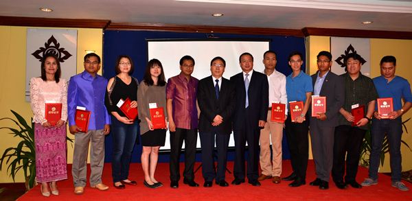 张文显副会长、柬埔寨司法部马林副部长、西南政法大学付子堂校长为“中国-东盟法律培训基地校友会”优秀论文代表颁发证书