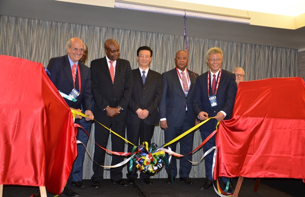 论坛开幕式上还举行了中非联合仲裁中心约翰内斯堡中心和上海中心的揭牌仪式,、南非豪登省检察院检察长安德鲁·乔克、安哥拉总检察长若昂·德索萨、津巴布韦总检察长托马纳、南部非洲仲裁基金会主席迈克尔·库伯、上海国际仲裁中心副主任李志刚、非洲非诉讼纠纷解决中心主席帕特里克·莱恩与中国法学会对外联络部主任谷昭民共同剪彩揭牌。揭牌仪式后,中国法学会对外联络部主任谷昭民作为中非联合仲裁中心名誉主席就中心的成立与发展做了专题演讲。
