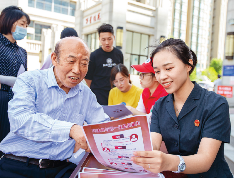 2020年6月6日,江苏省海安市立发街道嘉麟社区联合海安市人民法院开展“民法典让生活更美好”送法进社区活动,法院工作人员和社区普法志愿者把民法典内容简明易懂地告知居民,提高公民的法律素养,用民法典护航美好生活。 中新社发 翟慧勇/摄