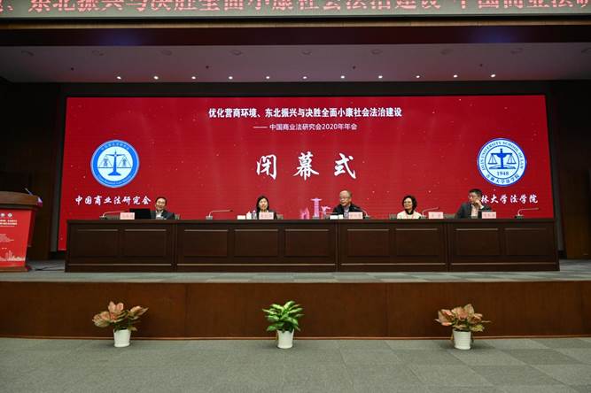 闭幕式由全国人大常委会法制工作委员会民法室原巡视员扈纪华主持。闭幕式上,山西财经大学教授马跃进首先对本次会议进行了学术研讨总结。接着,中国商业法研究会会长甘培忠致辞,他对获奖人员表示祝贺,也对年会承办方、协办方和参会嘉宾表示感谢,并宣布明年年会由西南政法大学承办。最后,西南政法大学高等研究院院长侯东德作为明年年会承办方发言,他预祝中国商业法研究会2021年年会成功召开。在全场热烈的掌声中,“优化营商环境、东北振兴与决胜全面小康社会法治建设”研讨会暨中国商业法研究会2020年年会圆满结束。
