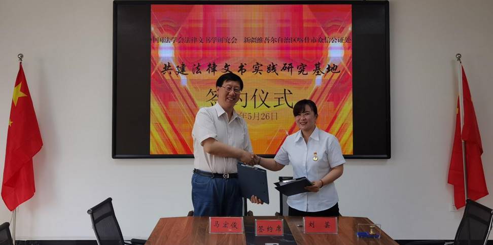 2021年5月26日,中国法学会法律文书学研究会会长马宏俊教授、副会长赵朝琴教授和副秘书长苗鸣宇副教授,以及理事河南财经政法大学法学院党委副书记焦永刚一行四人前往喀什众信公证处举行法律文书实践研究基地签约仪式。