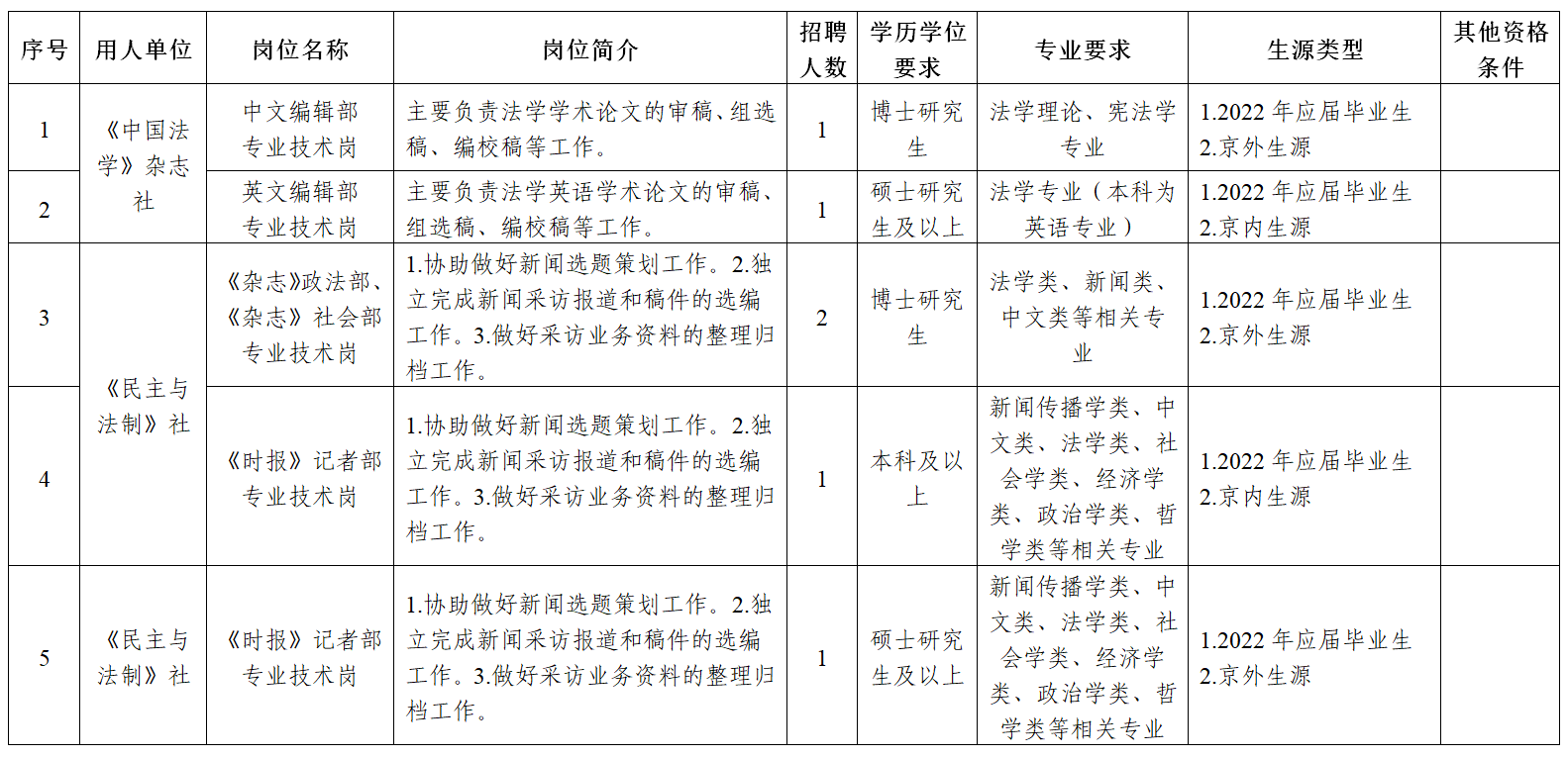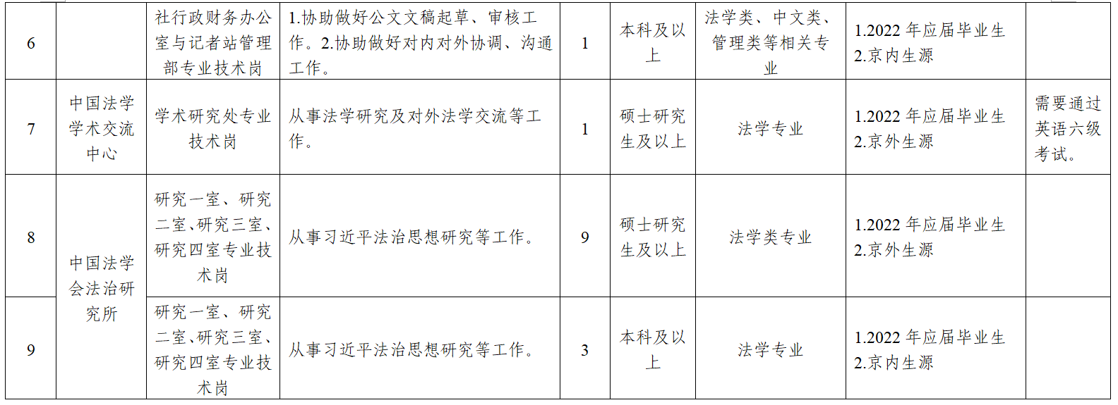 3.中国法学会法治研究所研究一室、研究二室、研究三室、研究四室专业技术岗位(京外生源)学历学位需求由“博士研究生”变更为“硕士研究生及以上”,其他资格条件需求删除“需要通过国家统一法律职业资格考试”。