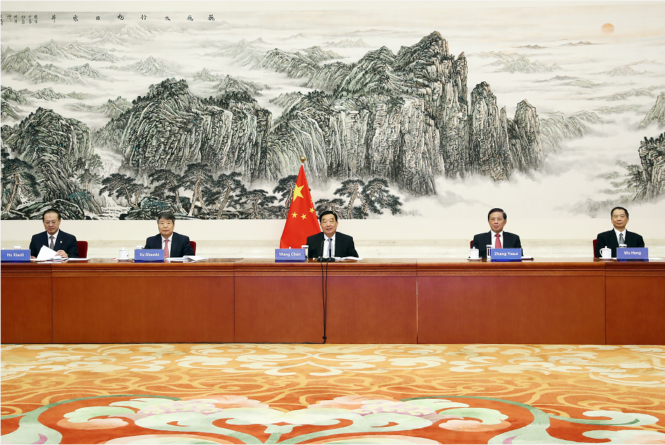 4月22日,中共中央政治局委员、全国人大常委会副委员长王晨在京以视频方式会见古巴全国人民政权代表大会副主席马查多。许麟 摄