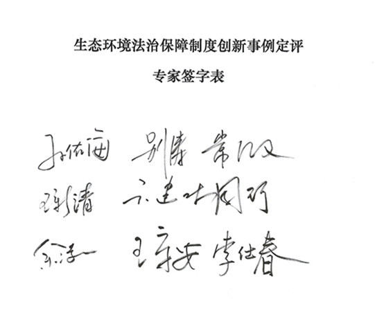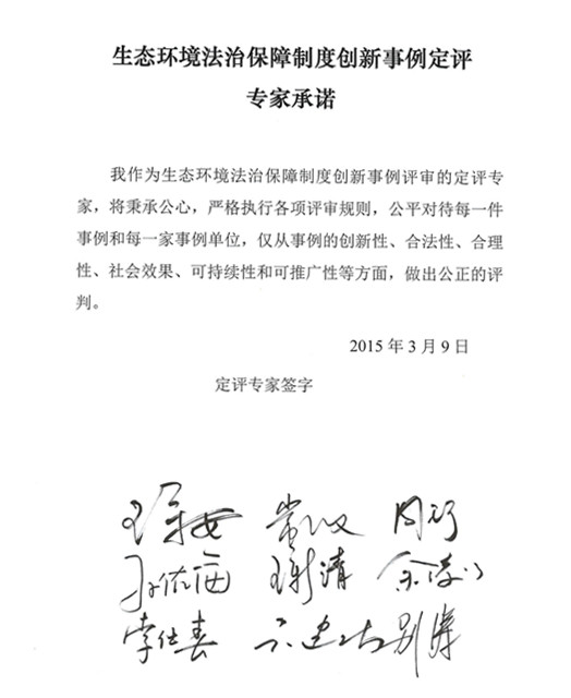 随后,中国法学会法律信息部吕兴焕副主任和王伟国副主任分别宣读了《生态环境法治保障制度创新事例定评办法(草案)》和专家承诺书,全体评审专家一致通过了定评办法,并在承诺书上签名。