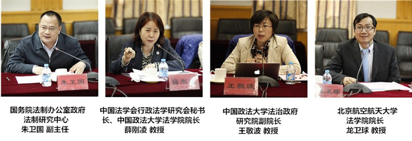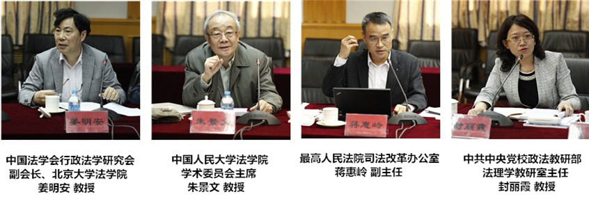 中国法学会行政法学研究会副会长、北京大学法学院姜明安教授,中国法学会法理学研究会副会长、中国法学会立法学研究会常务副会长、中国人民大学法学院学术委员会主席朱景文教授,最高人民法院司法改革办公室蒋惠岭副主任,中共中央党校政法教研部法理学教研室主任封丽霞教授,国务院法制办公室政府法制研究中心朱卫国副主任,中国法学会行政法学研究会秘书长、中国政法大学法学院院长薛刚凌教授,中国政法大学法治政府研究院副院长王敬波教授,北京航空航天大学法学院院长龙卫球教授先后发表了各自的观点和见解。