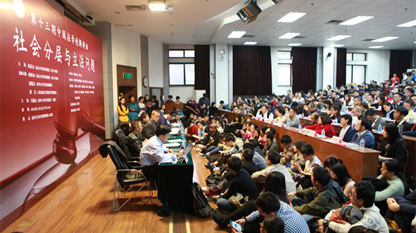 2015年11月12日下午,第13期“中国法学创新讲坛”在清华大学法学院隆重举行。讲坛由中国法学会法律信息部、清华大学法学院和中国法学会研究部共同承办,主题为“社会分层与立法问题”,由北京大学法学院朱苏力教授主讲,北京大学法学院强世功教授、清华大学法学院赵晓力副教授和上海交通大学凯原法学院郑戈教授协同主讲。中国法学会党组成员、副会长、学术委员会主任张文显教授出席讲坛并致辞。来自中国社会科学院、北京大学、清华大学、中国人民大学、北京师范大学、中央财经大学、中央民族大学、北京理工大学、国家食药总局高级研修学院和北京市政府法制办等高等院校、科研机构和实务部门的专家学者,以及在京各大高校的师生共400余人参加了讲坛。在近四个多小时的时间里,四位教授围绕“社会分层与立法问题”发表了深刻而精辟的见解,并与在场听众进行了积极深入的互动交流。讲坛由清华大学法学院院长王振民教授主持。