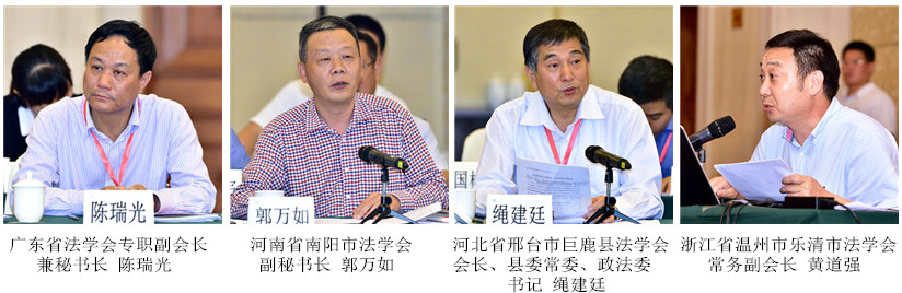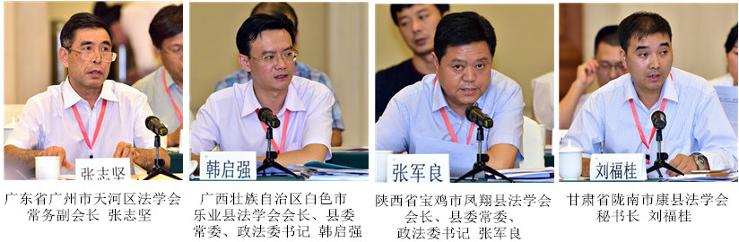 26日下午,广东省法学会专职副会长兼秘书长陈瑞光,河南省南阳市法学会副秘书长郭万如,河北省邢台市巨鹿县法学会会长、县委常委、政法委书记绳建廷,浙江省温州市乐清市法学会常务副会长黄道强,广东省广州市天河区法学会常务副会长张志坚,广西壮族自治区白色市乐业县法学会会长、县委常委、政法委书记韩启强,陕西省宝鸡市凤翔县法学会会长、县委常委、政法委书记张军良,甘肃省陇南市康县法学会秘书长刘福桂等8位领导分别交流了创办中立法律服务社、加强市县级法学会党组建设、参与社会治理工作,服务法治实践、开展法律服务和法治宣传以及会员发展管理等方面的工作情况。在会议座谈时,浙江省法学会专职副会长陆剑锋、河北省法学会常务副会长王奎连、广西壮族自治区法学会常务副会长李沛芬分别围绕典型经验介绍和会议交流发言,结合本省(区)法学会的工作实际,畅谈了心得体会和如何贯彻好这次会议精神,更好地指导推动本省(区)的县级法学会工作开展。