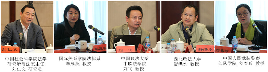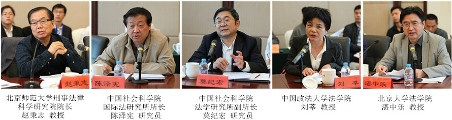 中国刑法学研究会会长、北京师范大学刑事法律科学研究院院长赵秉志教授,中国刑法学研究会常务副会长、中国社会科学院国际法研究所所长陈泽宪研究员,中国法学会宪法学研究会常务副会长、中国社会科学院法学研究所副所长莫纪宏研究员,中国法学会行政法学研究会副会长、中国政法大学法学院刘莘教授,中国法学会行政法学研究会副会长、北京大学法学院湛中乐教授,中国刑事诉讼法学研究会副会长、中国社会科学院法学研究所王敏远研究员,中国刑法学研究会副会长、吉林大学法学院张旭教授,中国法学会行政法学研究会副会长、清华大学公共管理学院于安教授,中国刑法学研究会常务理事、贵州省社会科学院院长吴大华教授,中国法学会行政法学研究会常务理事、清华大学法学院副院长余凌云教授,中国刑法学研究会常务理事、中国社会科学院法学研究所刑法室主任刘仁文研究员,国际关系学院法律系毕雁英教授,中国法学会行政法学研究会副秘书长、中国政法大学中欧法学院刘飞教授,新疆自治区政法委研究室副主任、西北政法大学舒洪水教授,中国人民武装警察部队学院刘春玲教授等参加会议,分别从宪法学、行政法学、刑法学、刑事诉讼法学、国际关系等角度,对《国家安全法》的实施问题进行了充分研讨,对《国家安全法》更好地贯彻实施提出了意见和建议。