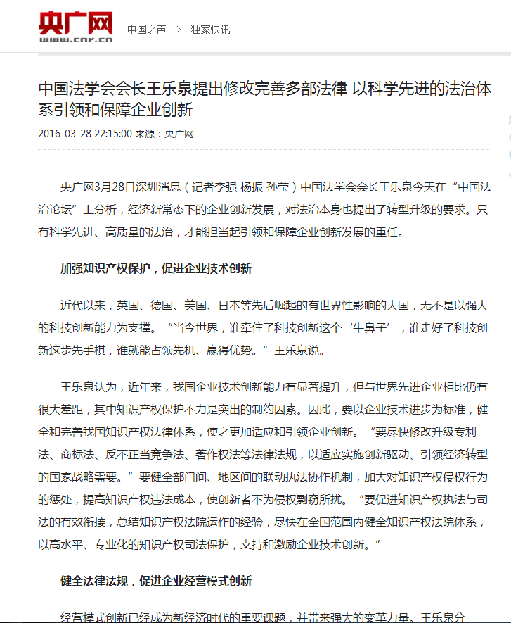 央广网【中国之声】:中国法学会会长王乐泉提出修改完善多部法律 以科学先进的法治体系引领和保障企业创新