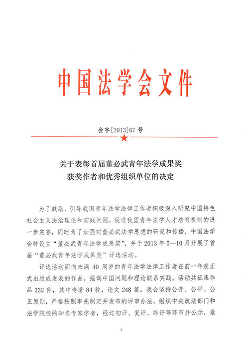 关于表彰首届董必青年法学成果奖获奖作者和优秀组织单位的决定