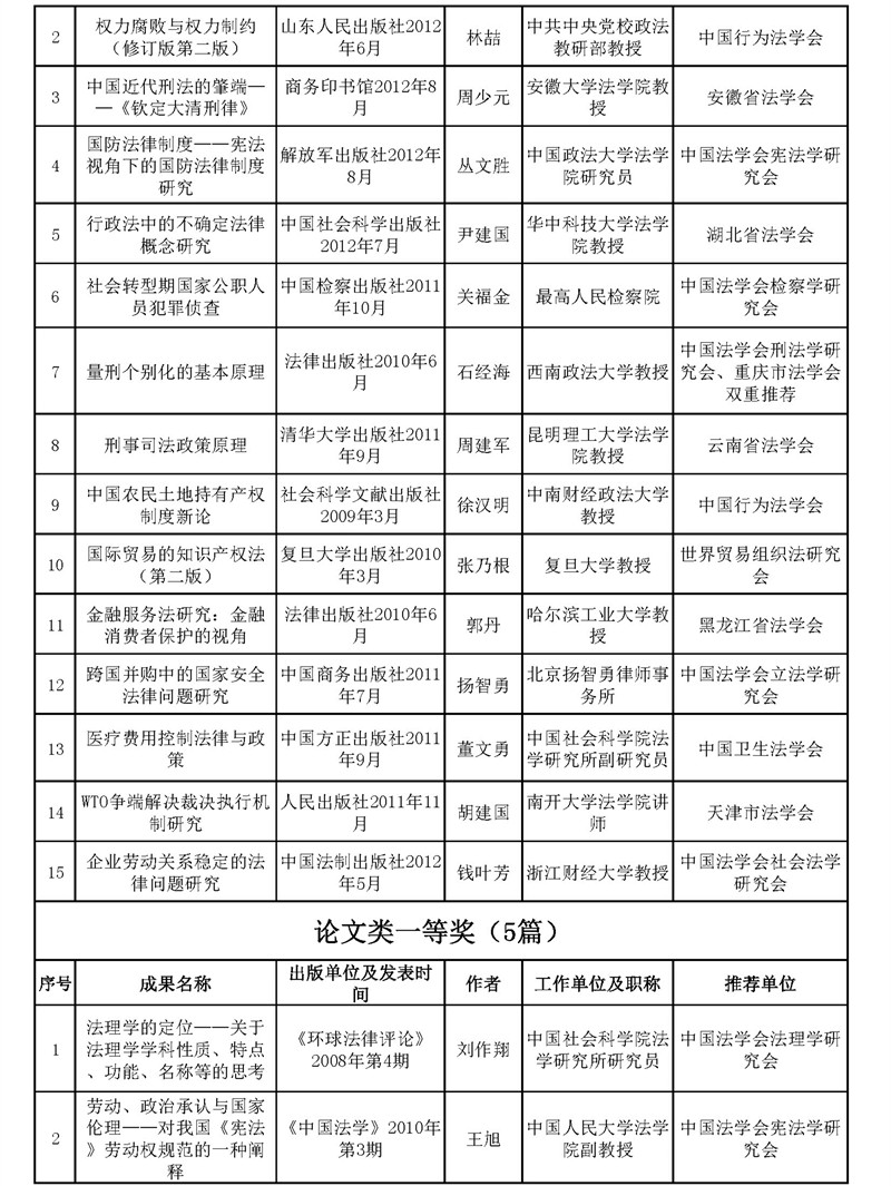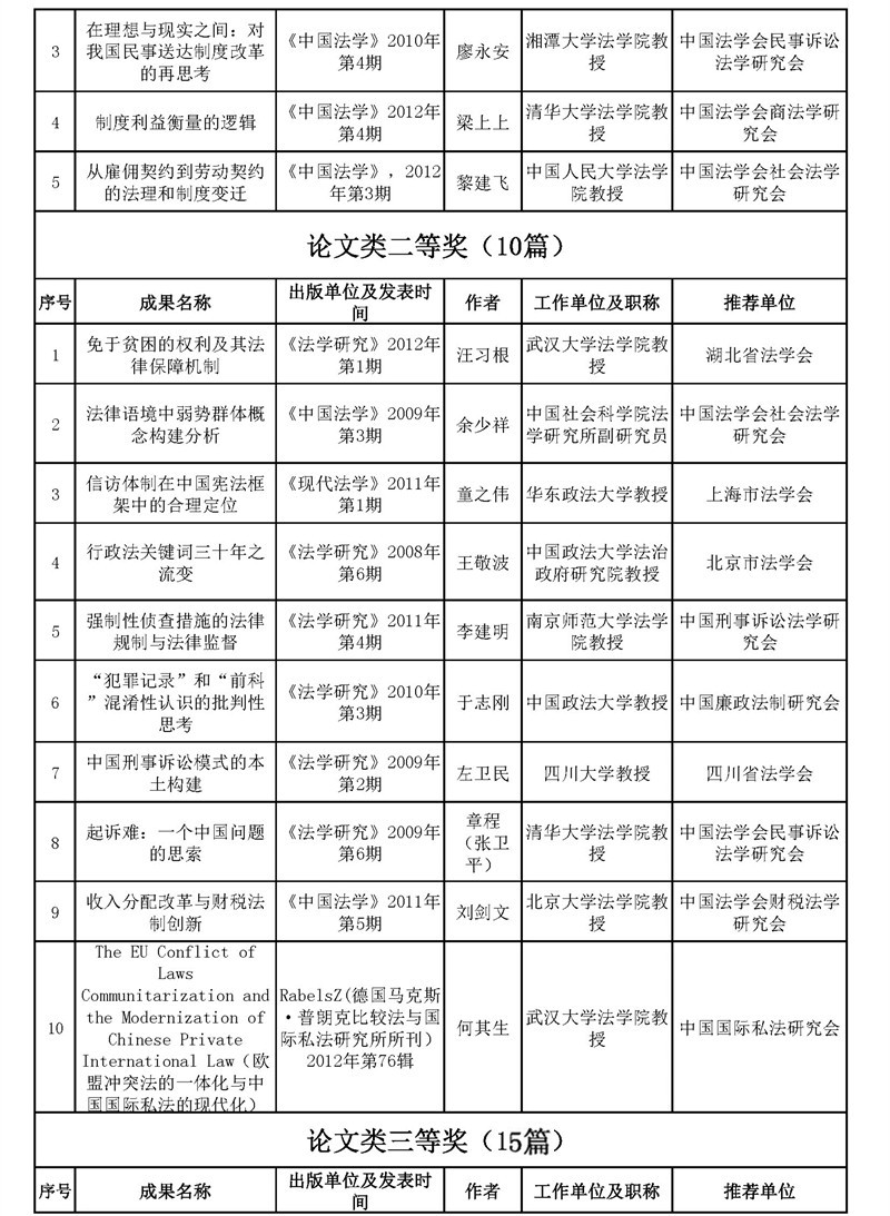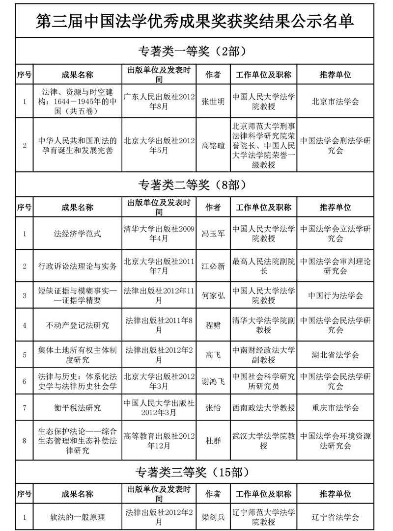 第三届“中国法学优秀成果奖”获奖结果公示名单