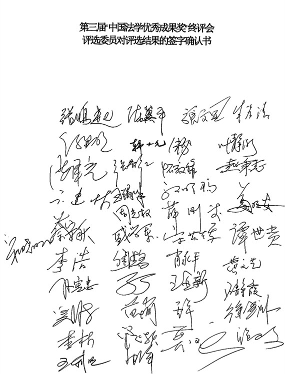随后,会议马上进入全体评委集中投票阶段。在张文显副会长的主持下,全体评委依次进行了论文类一、二、三等奖,专著类一、二、三等奖的投票。在进行论文类、专著类一、二等奖作品投票之前,均由6个学科组的召集人宣读了每一件候选作品的推荐理由。经过6个轮次的评选,全体评委通过无记名投票,产生了专著类一等奖2部、二等奖8部、三等奖15部;论文类一等奖5篇、二等奖10篇、三等奖15篇,并现场宣布投票结果。全体评委在评审结果上签字确认。其中,在投票产生一等奖论文时,出现了第三名有3件作品票数相同的情形。按照《第三届“中国法学优秀成果奖”评选办法》的规定,论文类一等奖的数额应当为3篇。但按照《第三届“中国法学优秀成果奖”终评工作细则》的规定,“各等级奖项最后一个名额如果出现并列,并列的成果均获该等级奖项,不再重复投票”。经过全体评委讨论决定,上述3件票数相同的作品连同排名第一、二名的作品均获得论文类一等奖。