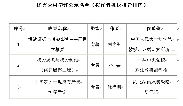 第三届“中国法学优秀成果奖”评选活动共收到8部(篇)申报成果,经我会初评委员会评审,选出优秀成果3部(篇)。现将初评结果予以公示(见下表),公示期为2014年9月19—27日。如对评审结果有异议,请在公示期内与秘书处联系。
