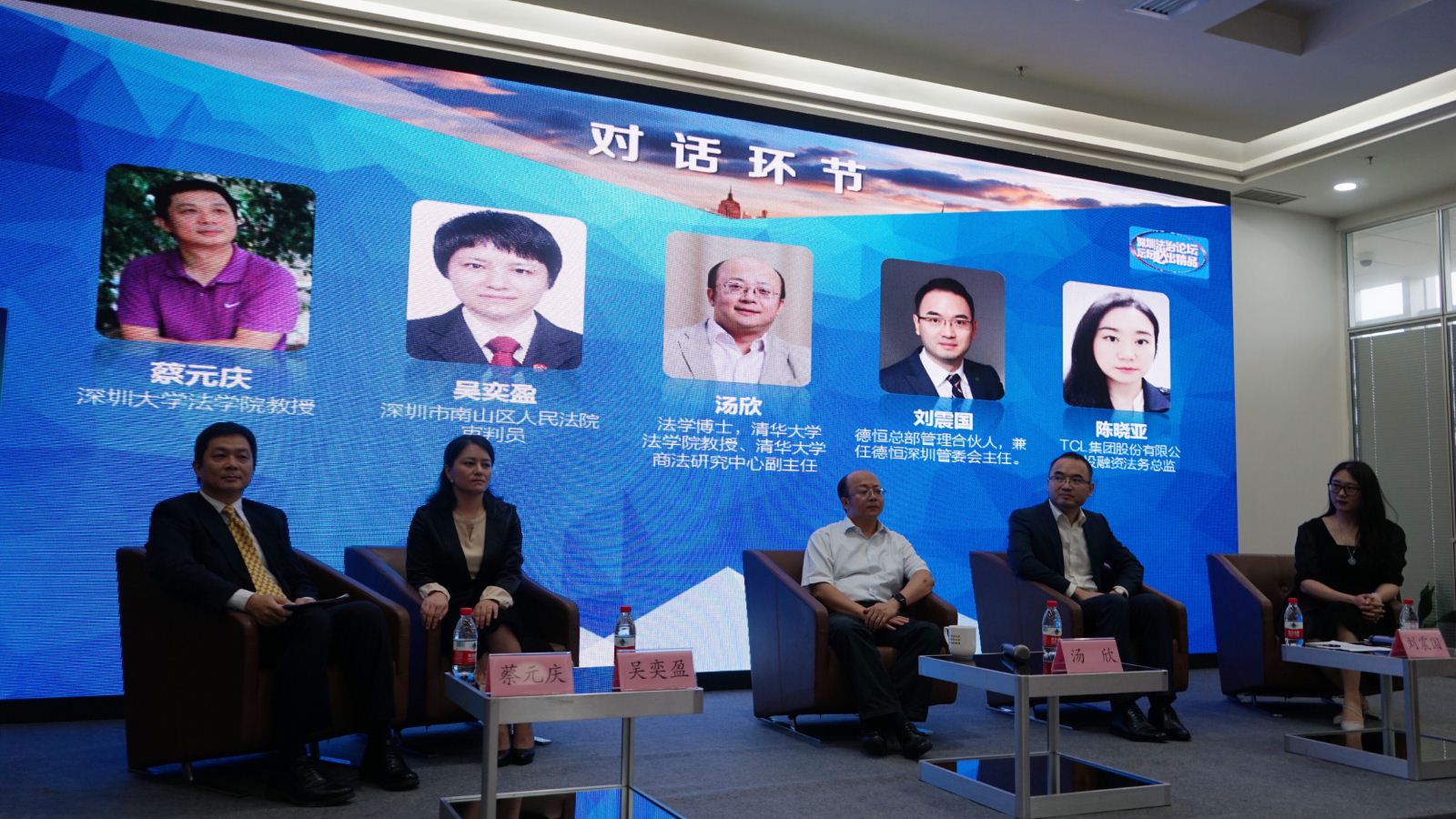 在对话环节,深圳大学法学院教授蔡元庆担任嘉宾主持,南山区人民法院蛇口自贸区审判团队主审法官吴奕盈、北京德恒(深圳)律师事务所管理合伙人刘震国律师、TCL集团股份有限公司投融资法务总监陈晓亚就反收购策略、上市公司章程中的反收购条款等问题与汤欣展开讨论,并回答了网络征集的和现场观众提出的相关问题。
