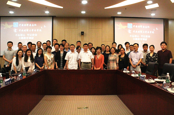 2019年6月28日上午,为贯彻落实《中共中央关于在全党开展“不忘初心、牢记使命”主题教育的意见》(中发〔2019〕19号),根据中国法学会安排部署并结合本单位工作实际,中国法学杂志社党支部书记张新宝同志率中国法学杂志社全体同志赴中央财经大学法学院开展“不忘初心、牢记使命”主题教育调研座谈会。中央财经大学法学院党委书记吴韬同志主持座谈会并致欢迎辞,法学院党委委员、院长尹飞同志,法学院师生代表和《财经法学》部分编辑人员参加会议。