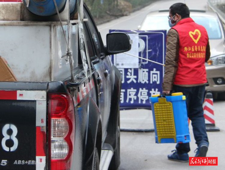重庆黔江区与湖北省咸丰县大路坝交界疫情检测点,法学会会员、司法局工作人员陈兵为两省过往物资车辆消毒。 重庆市法学会/供图