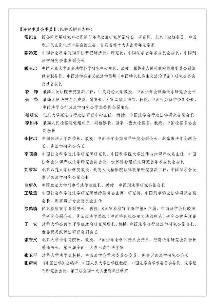 中国法学会领导高度重视本次终评工作,专门成立了“董奖”终评专家委员会。中国法学会党组书记、常务副会长陈冀平同志担任评审委员会主席,中国法学会副会长张文显同志、王其江同志担任评审委员会副主席,评审委员由来自政法部门和法学院校的17位著名法学专家组成。