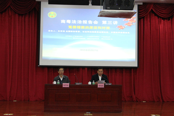 2015年1月27日上午,“南粤法治报告会”第三讲,在南方报业传媒集团报告厅隆重举行。全国政协常委、社会和法制委员会副主任、中国法学会副会长朱孝清同志作题为《冤假错案的原因与对策》的报告。省政协副主席、省法学会会长梁伟发主持了报告会。