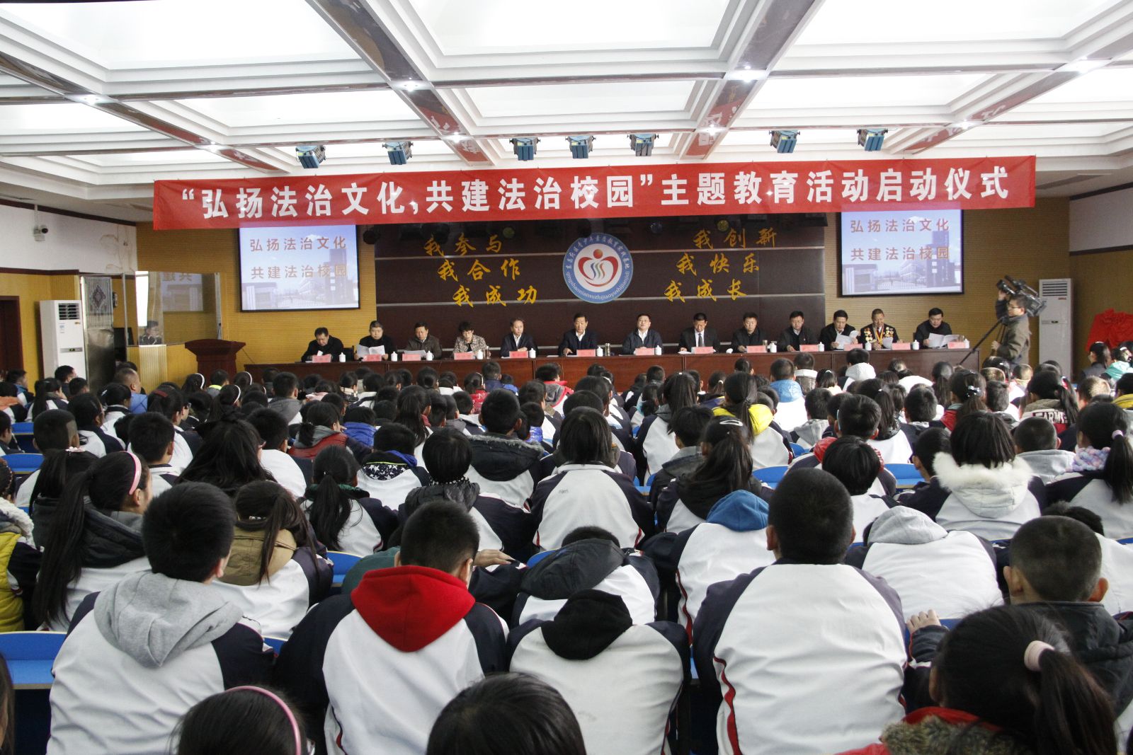 启动仪式由聊城市委政法委副书记、法学会会长郝润霞主持。市教育局党组书记、局长哈宝泉同志宣读了《关于在全市开展“弘扬法治文化,共建法治校园”主题教育活动的意见》,学生代表张伊扬同学向全市中小学生发出了“遵纪守法,明礼诚信”的倡议,市委常委、政法委书记刘强同志和市委常委、常务副市长耿涛同志共同为“青少年法治教育基地”揭了牌,进行了“学法、用法、守法,弘扬法治文化、共建法治校园”现场签字仪式,并邀请“全国模范检察官”白云为青少年学生作了首场法治教育报告。