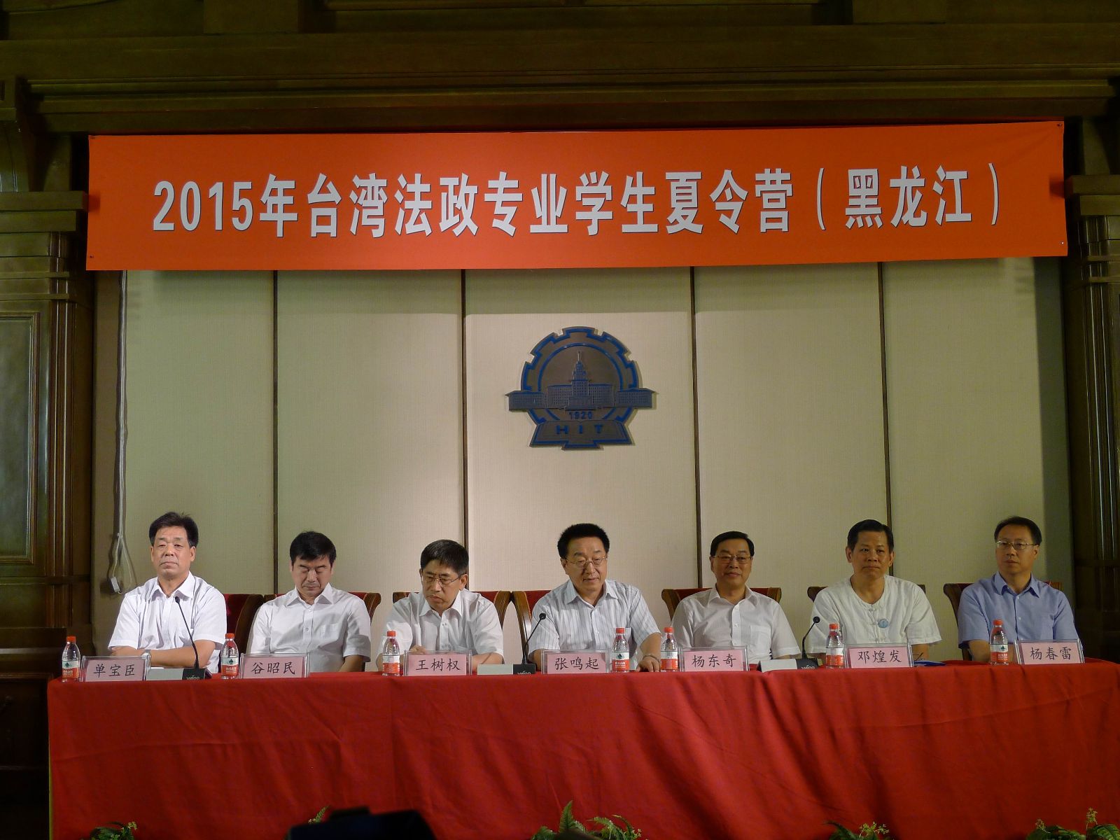 7月14日,2015年台湾法政专业学生夏令营活动开营式在哈尔滨工业大学博物馆隆重举行。中国法学会副会长张鸣起,黑龙江省委常委、政法委书记、省法学会会长杨东奇,哈尔滨工业大学党委书记王树权,台湾向阳公益基金会执行长邓煌发,海峡两岸法学交流协会秘书长廖尉均出席开营式并致辞,黑龙江省委政法委副书记、省法学会常务副会长杨春雷,中国法学会对外联络部主任谷昭民等出席开营式。开营式由黑龙江省法学会专职副会长单宝臣主持。2015年台湾法政专业学生夏令营活动全体营员,以及哈尔滨工业大学法学院部分师生参加了开营式。