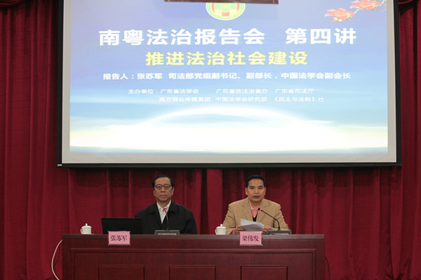 2015年3月12日上午,“南粤法治报告会”第四讲在在南方报业传媒集团报告厅隆重举行。司法部党组副书记、副部长,中国法学会副会长张苏军做题为《推进法治社会建设》的专题报告。省政协副主席、省法学会会长梁伟发主持了报告会。