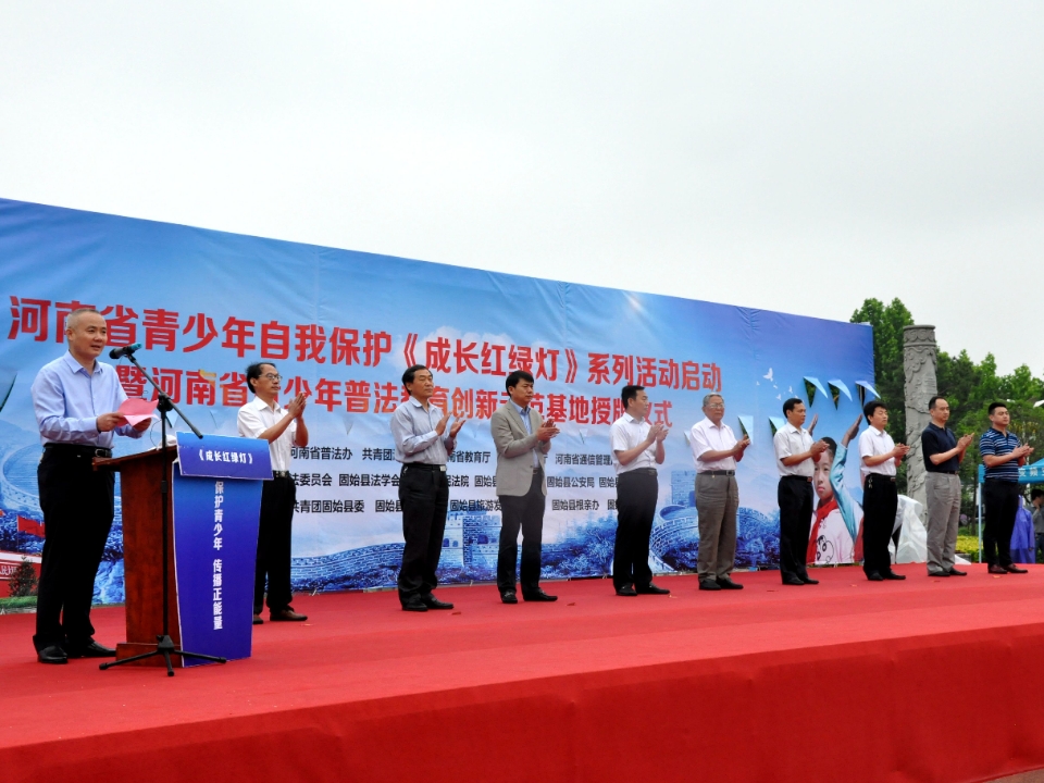 为丰富“七五”普法内容,创新青少年法治教育载体,提升法治教育质量和实效,推进河南省普法教育工作深入开展,5月23日,由河南省法学会、省普法办、共青团河南省委、教育厅、文化厅共同主办,固始县委政法委、固始县法学会等相关单位承办的“河南省青少年自我保护《成长红绿灯》系列活动暨河南省青少年普法教育创新示范基地授牌”仪式在固始县成功广场举行,该系列活动的主题是“保护青少年 传播正能量”。