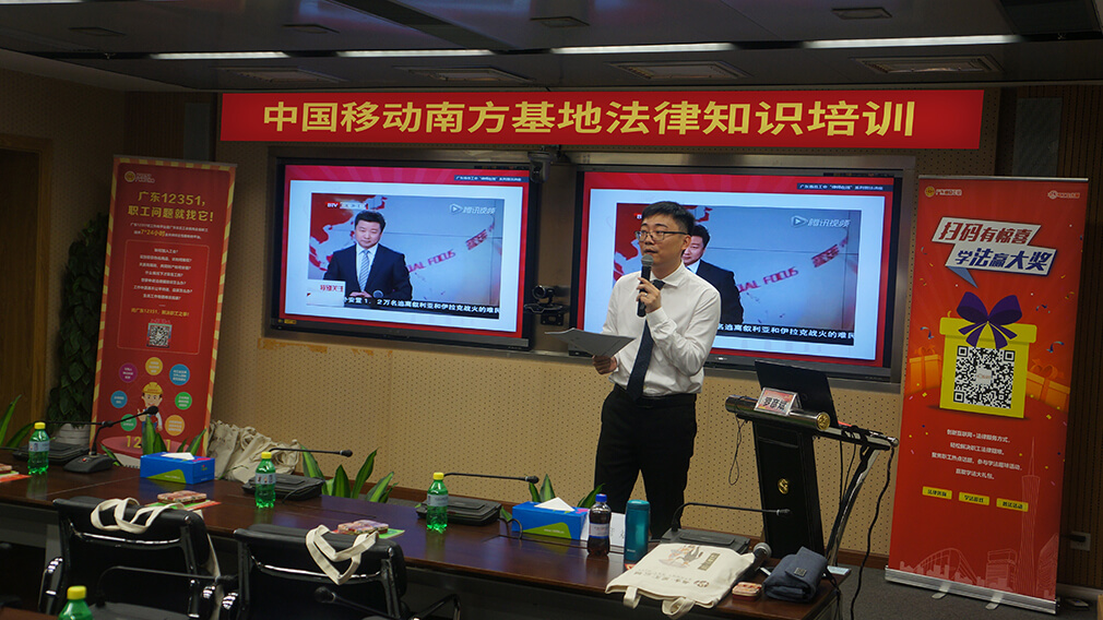 在下午的普法讲座上,广东省总工会“律师在线”专门邀请资深律师罗彦斌担任中国移动南方基地职工法律知识培训的主讲嘉宾,采取“以案说法”和法律知识竞赛等方式,通过对相关法律条款的内涵解读和典型案件的深刻剖析,结合企业实际主讲了《劳动法》、《网络安全法》和《生活法律知识》三个方面的内容,并现场开展职工法律知识竞赛活动,赢得了在场职工的好评。