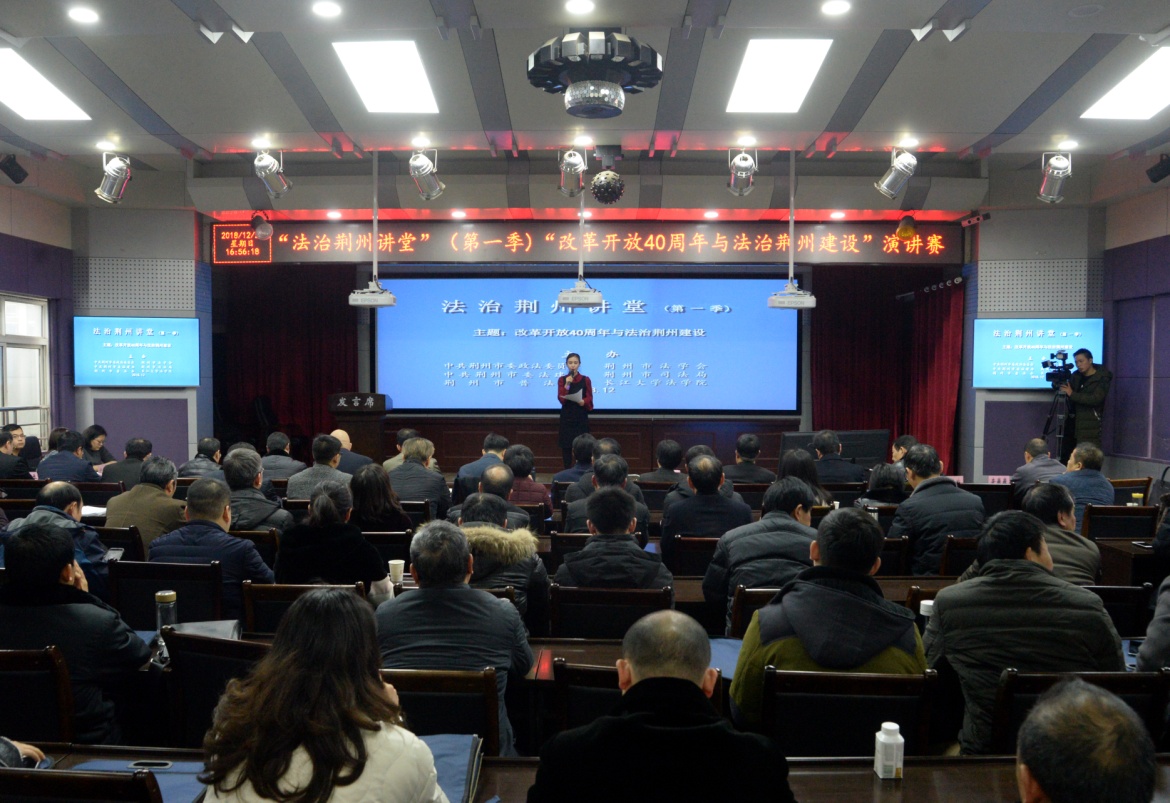 为推进法治荆州建设,12月23日下午,湖北省荆州市委政法委、市法学会与市委法建办、市司法局、市普法办、长江大学法学院共同开办以“改革开放40周年与法治荆州建设”为主题的“法治荆州讲堂”第一季演讲比赛。湖北省法学会党组成员、秘书长王龙,荆州市委副书记、政法委书记周静,荆州市人大常委会副主任、市法学会会长张钦,副市长、市委政法委第一副书记、市公安局局长黄庭松出席活动并为获奖者颁奖。