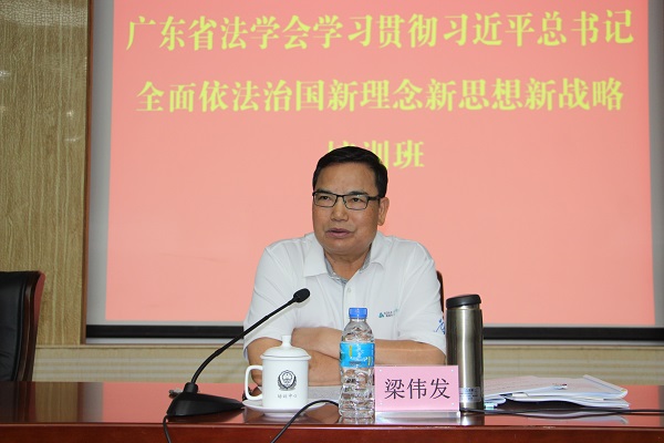 10月18日下午,广东省法学会在省公安厅民警培训中心召开学习贯彻习近平总书记全面依法治国新理念新思想新战略培训班,省法学会会长梁伟发出席活动并讲话,省法学会副会长梁德标主持培训班。