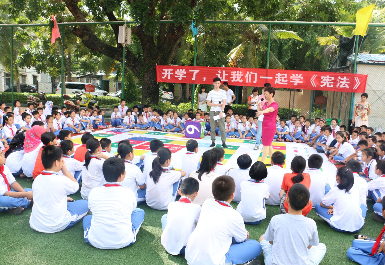 9月12日,《法制日报》海南记者站的记者和三亚市法学会工作人员以及三亚学院法学院的大学生志愿者们一同走进三亚双品实验学校,与五、六年级的小朋友们一起玩学《宪法》游戏,拉开了普法游戏进校园的序幕。