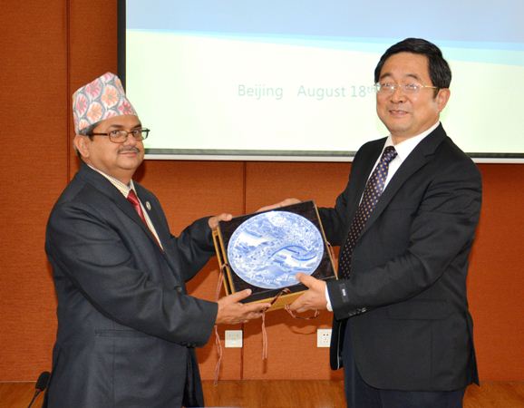 中国社科院法学所副所长莫纪宏向尼泊尔法律专家代表团团长比达里赠送纪念品