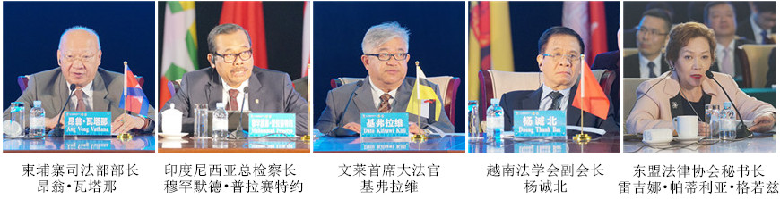中国法学会党组书记、常务副会长,全国政协常委、社会和法制委员会副主任陈冀平主持开幕式并作主旨发言。广西壮族自治区党委书记彭清华,最高人民法院副院长姜伟、最高人民检察院副检察长徐显明、司法部副部长刘振宇出席开幕式并致辞。柬埔寨司法部部长昂翁•瓦塔那、印度尼西亚总检察长穆罕默德•普拉赛特约、文莱首席大法官基弗拉维、越南法学会副会长杨诚北、东盟法律协会秘书长雷吉娜•帕蒂利亚•格若兹、马来西亚马来亚首席法官丹斯里艾哈迈德•马洛、泰国中央知识产权和国际贸易法院院长苏维查•娜加瓦拉、新加坡最高法院大法官艾迪阿都拉、缅甸联邦最高法院大法官钦貌基、老挝最高法院副院长坎帕•森达拉等东盟国家法律界高层官员出席论坛并分别在开幕式、闭幕式致辞或作主旨发言。