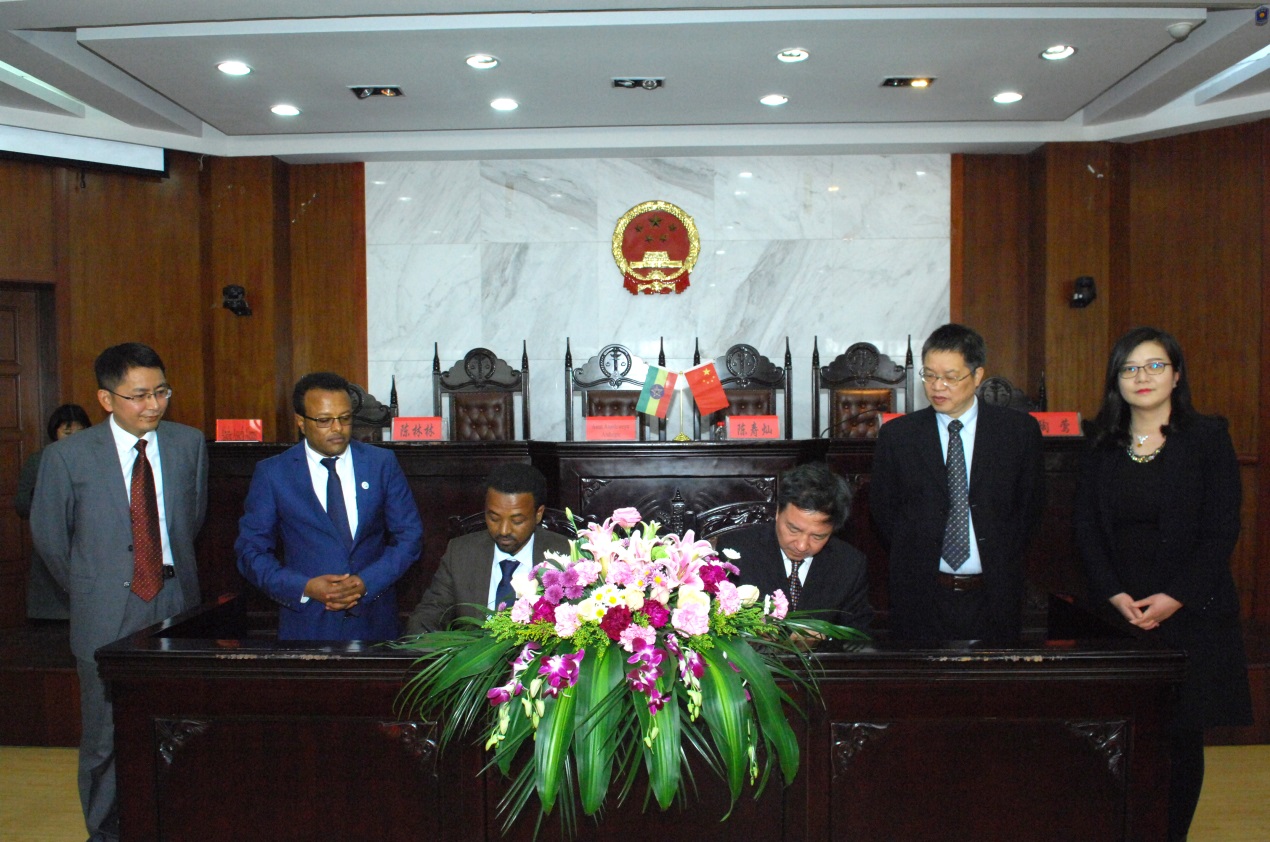 1月15日下午,由中国浙江工商大学与埃塞俄比亚贡德尔大学合作共建的“中国-埃塞俄比亚/非洲法律研究中心和培训基地”(以下简称“中心和基地”)揭牌暨合作备忘录签署仪式在浙江工商大学法学院、知识产权学院模拟法庭隆重举行。浙江工商大学副校长戴文战主持仪式。浙江工商大学校长陈寿灿和贡德尔大学副校长阿斯拉特·安达吉在仪式上致辞,签署校际合作备忘录,并共同为“中心和基地”揭牌。中国法学会外联部祁蒙宣读了外联部副主任杨小平的贺信。贡德尔大学法学院院长阿贝贝·阿莱穆,浙江工商大学国际处处长陶莺,法学院、知识产权学院院长陈林林、副院长宋杰及近百名师生出席仪式。