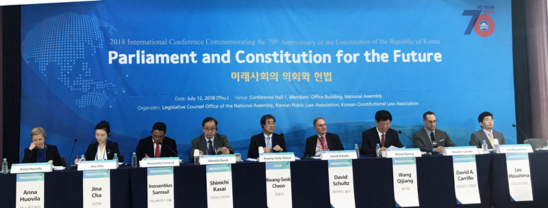 本次大会主题为“未来的议会与宪法”,由韩国国会法制室、韩国公法学会、韩国宪法学会共同主办。来自韩国、日本、美国、德国、印度、芬兰、印度尼西亚、南非等国的100多名法学法律界人士出席会议。韩国国会事务总长金星坤、韩国公法学会会长金裕焕、韩国宪法学会会长高文炫等分别在开幕式致辞。