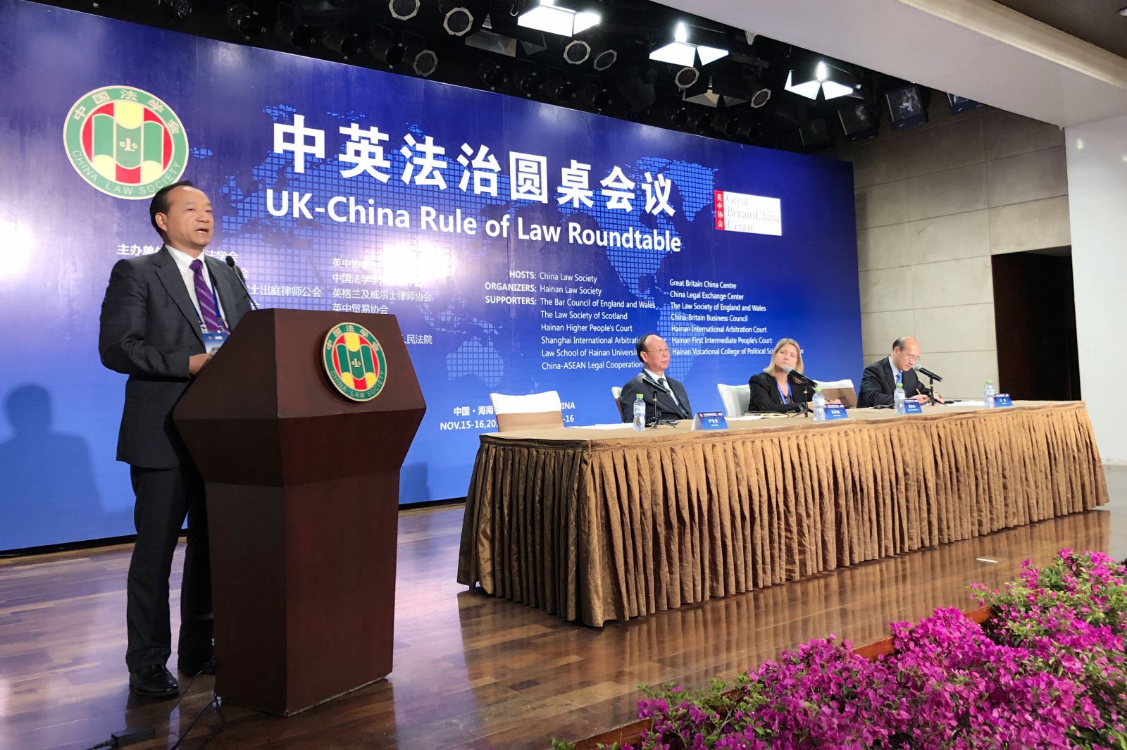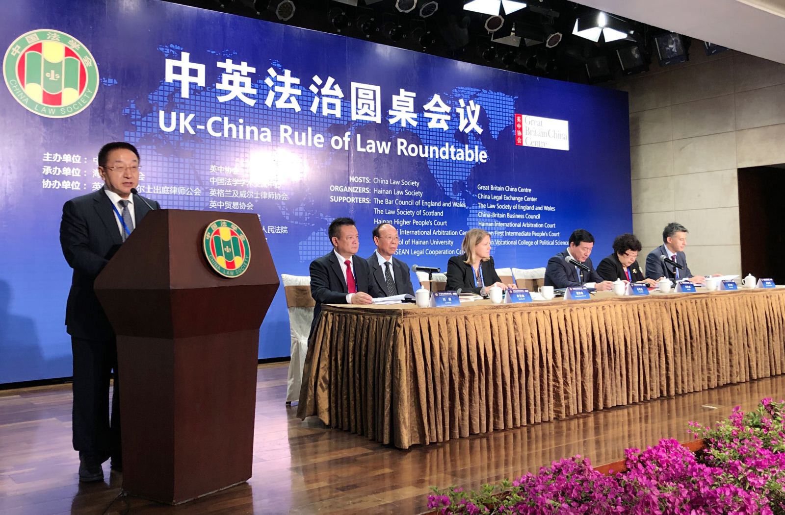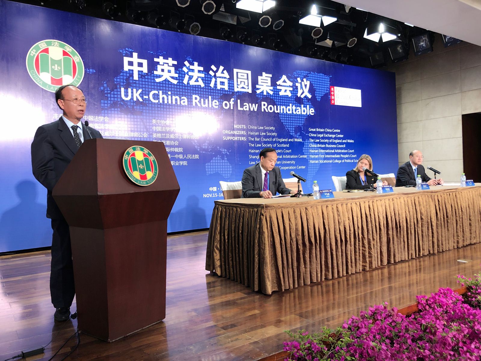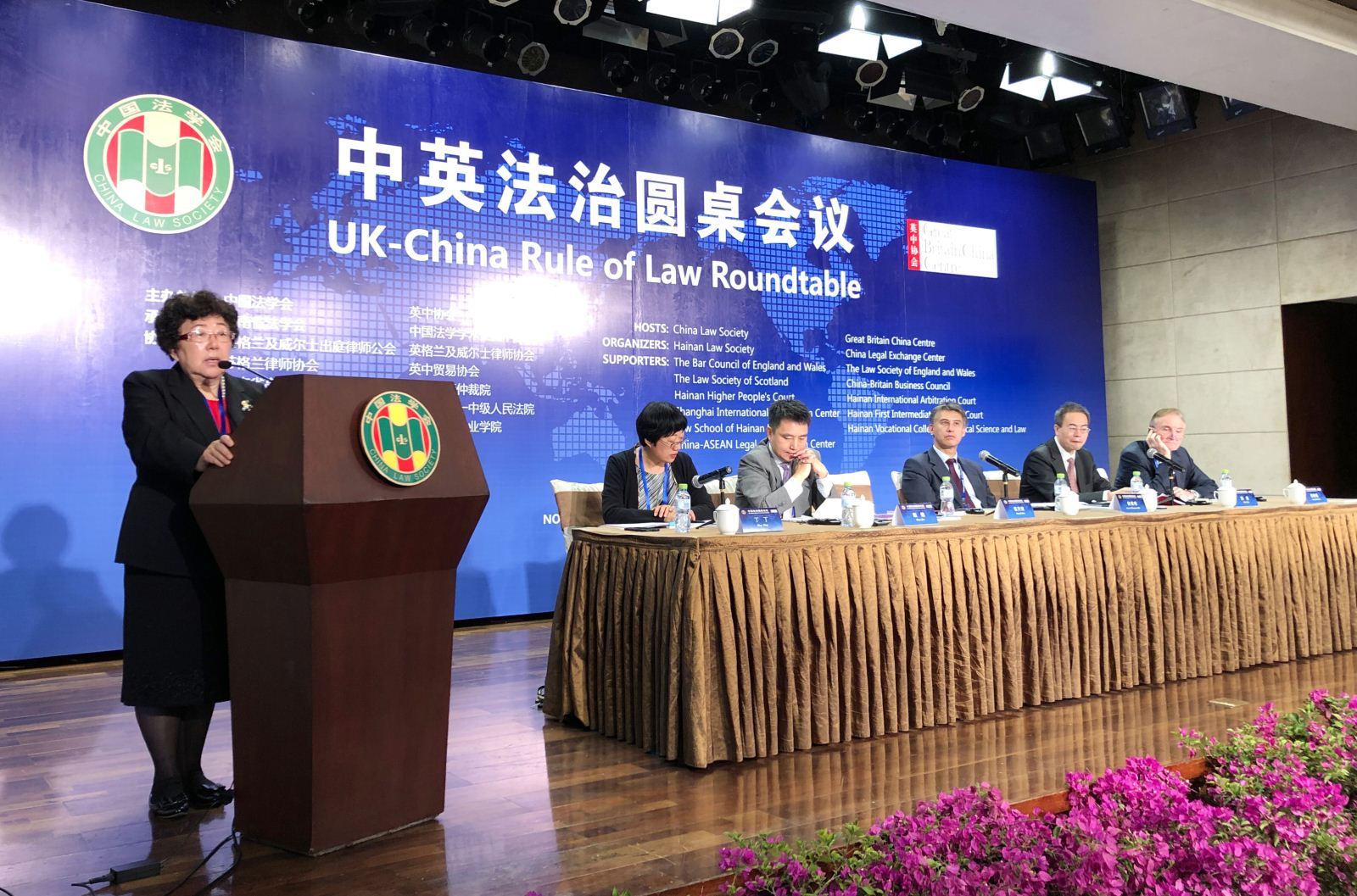 2018年11月15日,由中国法学会与英国英中协会主办,海南省法学会与中国法学学术交流中心承办的第三届“中英法治圆桌会议”在海口隆重开幕。会议主题为“加强国际商事争端解决机制合作 助力自由贸易区建设”。来自中英两国的120位法学法律界、企业界和政府部门代表出席会议。中国法学会副会长张鸣起,英中协会执行主任葛珍珠在开幕式上致辞。世界贸易组织上诉机构前主席、大法官张月姣,最高人民法院民四庭庭长张勇健,英格兰及威尔士出庭律师公会中国部主任林英明,环宇中国东盟法律合作中心理事长、海南仲裁委员会(海南国际仲裁院)主任施文,中国国际经济贸易仲裁委员会仲裁院副院长赵健,中国仲裁法学研究会专职副秘书长陈建,中华全国律师协会副会长章靖忠,海南省高级人民法院审判委员会专职委员皮修雁,海南省司法厅副厅长林琳,北京大学(深圳)国际法学院杰出常驻教授、最高人民法院国际商事专家委员会专家委员范思深,英国有效争议解决中心亚太地区主任范维敦等出席会议并做专题发言。海南省法学会党组书记、会长肖若海,中国法学学术交流中心主任尹宝虎以及葛珍珠分别在闭幕式上做会议总结讲话。