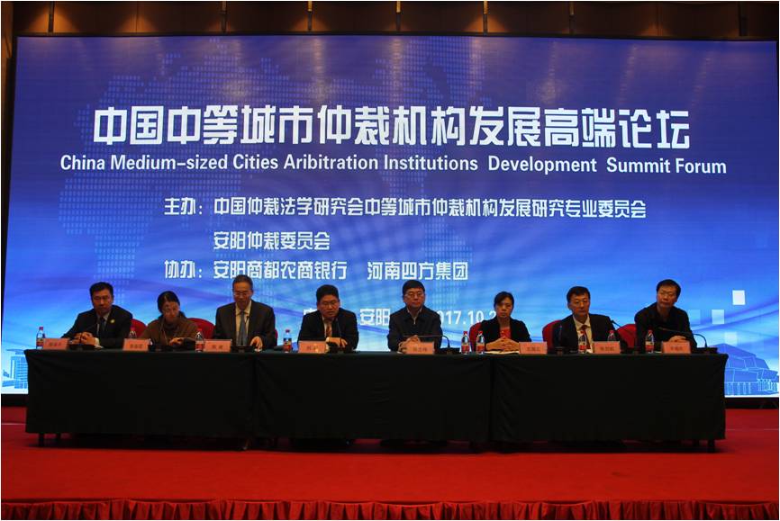 2017年10月26日,由中国仲裁法学研究会中等城市仲裁机构发展研究专业委员会、安阳仲裁委员会主办,安阳商都农商银行、河南四方集团协办的中国仲裁法学研究会中等城市仲裁机构发展研究专业委员会揭牌仪式暨高端论坛和业务培训在安阳举行。