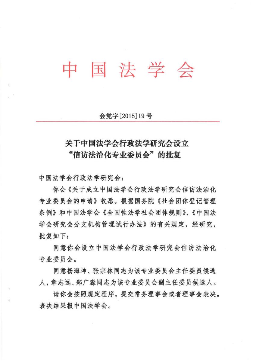 关于中国法学会行政法学研究会设立“信访法治化专业委员会”的批复