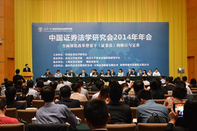 本次年会由武汉大学法学院、武汉大学资本市场法治研究中心承办。来自全国高等院校、司法部门、证监会、证交所、新闻媒体和其他一些单位的二百多名代表与嘉宾出席了本次会议。年会围绕“全面深化改革背景下《证券法》的修订与完善”主题,从“《证券法》修改的方向与路径”、“市场深化背景下的监管转型”、“资本市场创新与证券法制回应”三个专题展开了热烈讨论。
