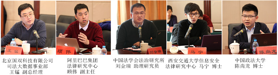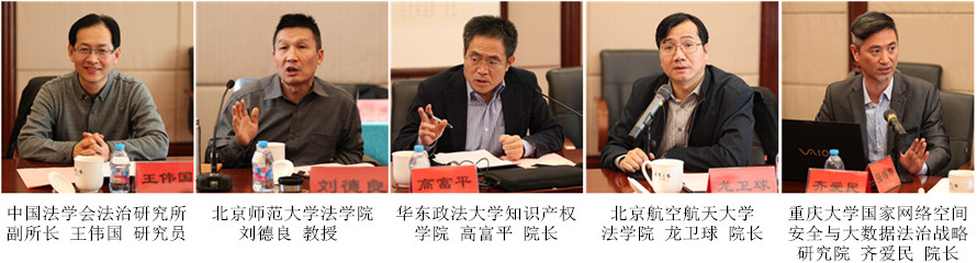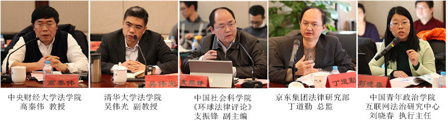 研讨会分为领导致辞、专家发言、自由讨论和总结讲话四个环节,由中国法学会法治研究所副所长王伟国研究员主持。在专家发言阶段,北京师范大学法学院教授、亚太网络法律研究中心主任刘德良,华东政法大学知识产权学院院长、教授高富平,北京航空航天大学法学院院长、教授龙卫球,重庆大学国家网络空间安全与大数据法治战略研究院院长、教授齐爱民,中央财经大学法学院教授高秦伟,清华大学法学院副教授吴伟光,中国社会科学院《环球法律评论》副主编、副研究员支振锋,京东集团法律研究部总监丁道勤,中国青年政治学院互联网法治研究中心执行主任刘晓春,北京国双科技有限公司司法大数据事业部副总经理王锰,阿里巴巴集团法律研究中心副主任顾伟,中国法学会法治研究所助理研究员刘金瑞,西安交通大学信息安全法律研究中心博士马宁,中国政法大学博士陈尚龙等专家学者作了精彩的发言。