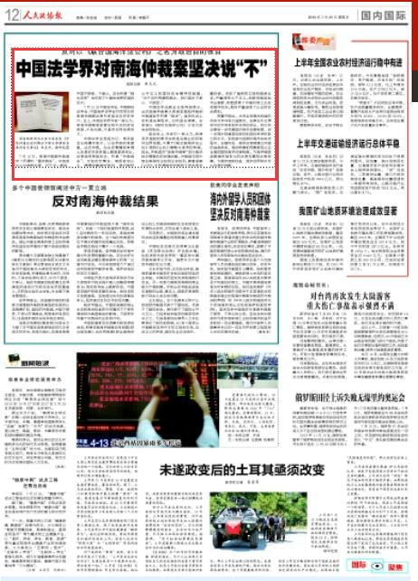国务院新闻办公室日前发表《中国坚持通过谈判解决中国与菲律宾在南海的有关争议》白皮书。新华社发7月12日,南海仲裁案仲裁庭发布了所谓的“最终裁决”,中国政府已公开表明态度,对于这一裁决,中国不接受、不承认。这份所谓“裁决结果”也引起了中国法学界的强烈反对。