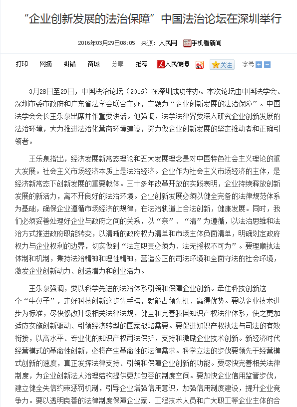 人民网:“企业创新发展的法治保障”中国法治论坛在深圳举行