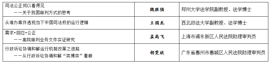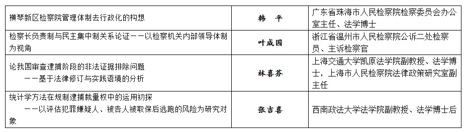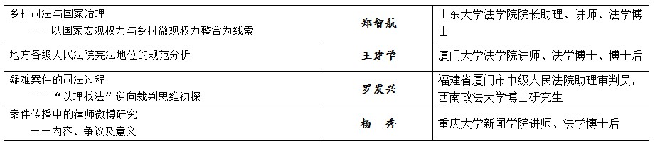 论坛组委会经综合考虑获奖论文的选题价值和内容,作者的年龄(不超过40周岁)、地域分布和职业等因素,从28篇一等奖论文中确定8篇,从60篇二等奖论文中确定4篇,共计12篇作为第八届中国法学青年论坛报告论文。郑智航博士等12位获奖论文的作者担任论坛报告人。论坛组委会对入选论文分为“一般理论”、“审判权配置及运行机制”、“检察权配置及运行机制”等三类,并将之设置为论坛的三个单元。