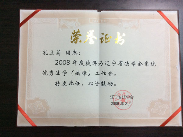 孔立菊荣获2008年度辽宁省法学会系统优秀法学(法律)工作者荣誉称号