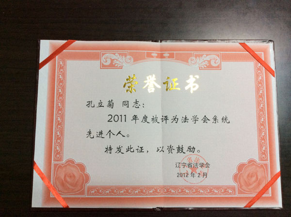 孔立菊荣获2011年度辽宁省法学会系统先进个人荣誉称号