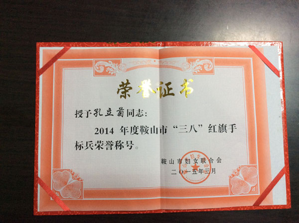 孔立菊荣获2014年度鞍山市“三八”红旗手标兵荣誉称号